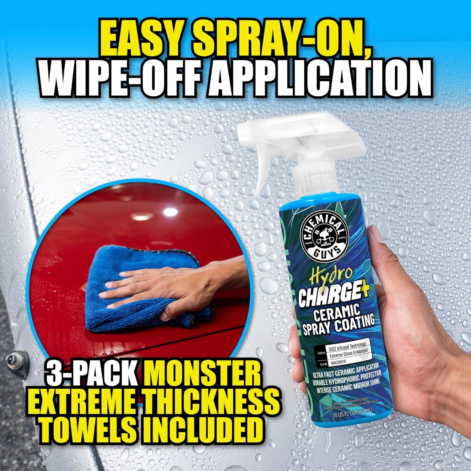 Chemical Guys Hydro Charge Ceramic Spray Coating 16 Fl Oz, with Monster Extreme Microfiber Towels (3 Pack) High Gloss Paint Protection Spray with Thick Plush Towels for Car Wash Drying and Detailing(16 Fl Oz (Pack of 1))
