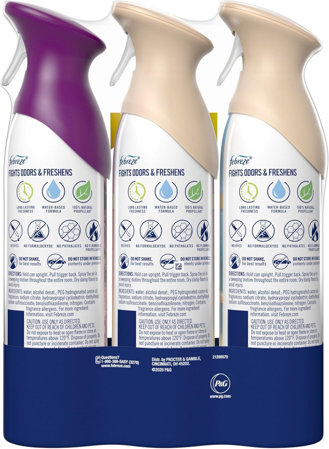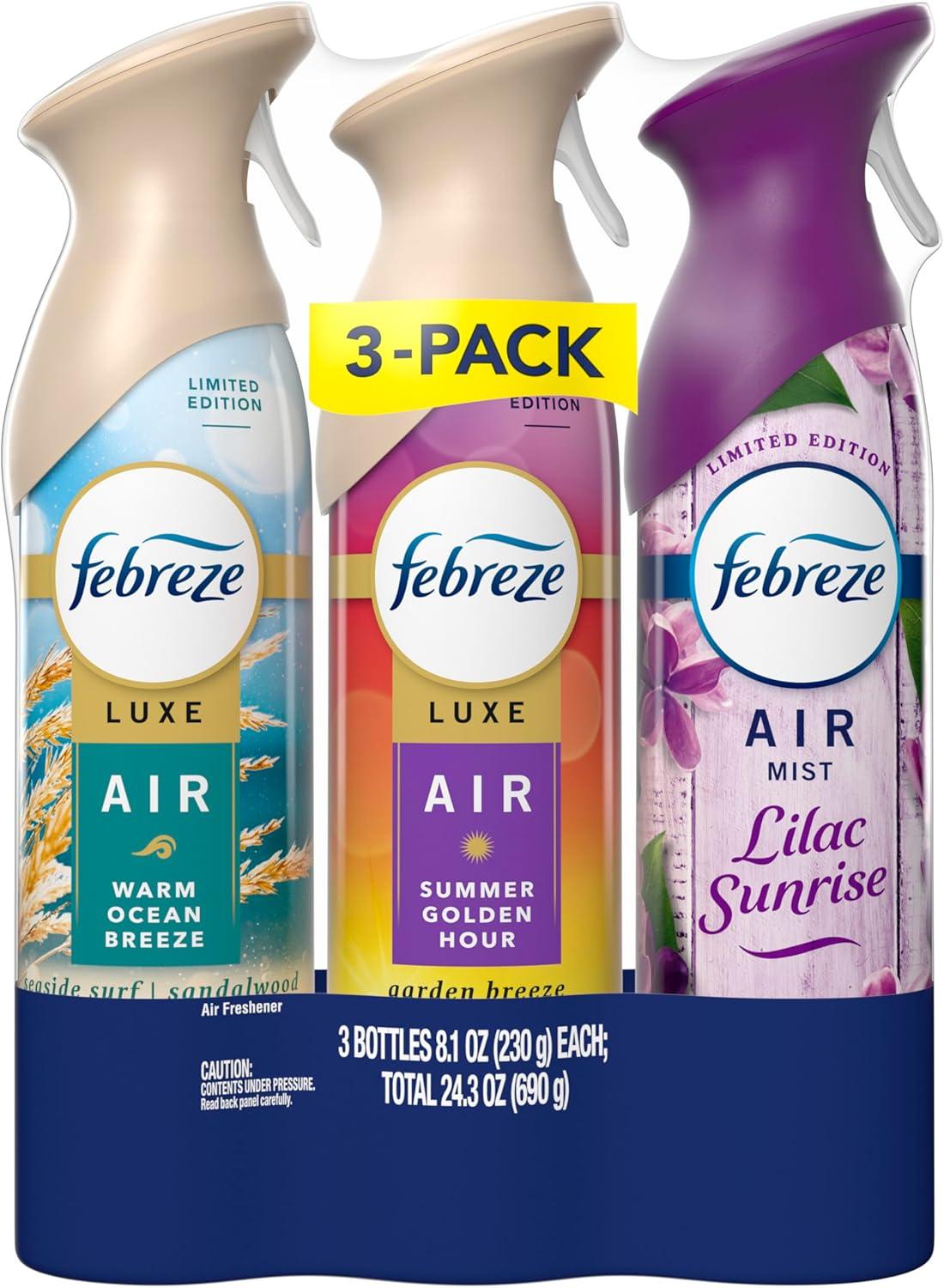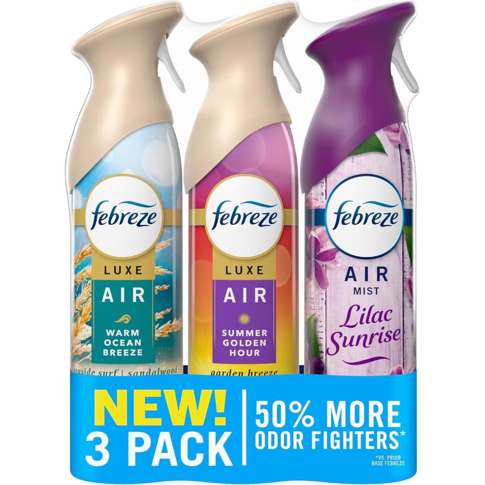 imageFebreze Air Mist Air Freshener Odor Fighting Room Spray Deodorizer for Home Bathroom Kitchen Office Apartment Lilac Sunrise Warm Ocean Breeze Summer Golden Hour Variety Pack 81oz Pack of 3Spring Mix Pack
