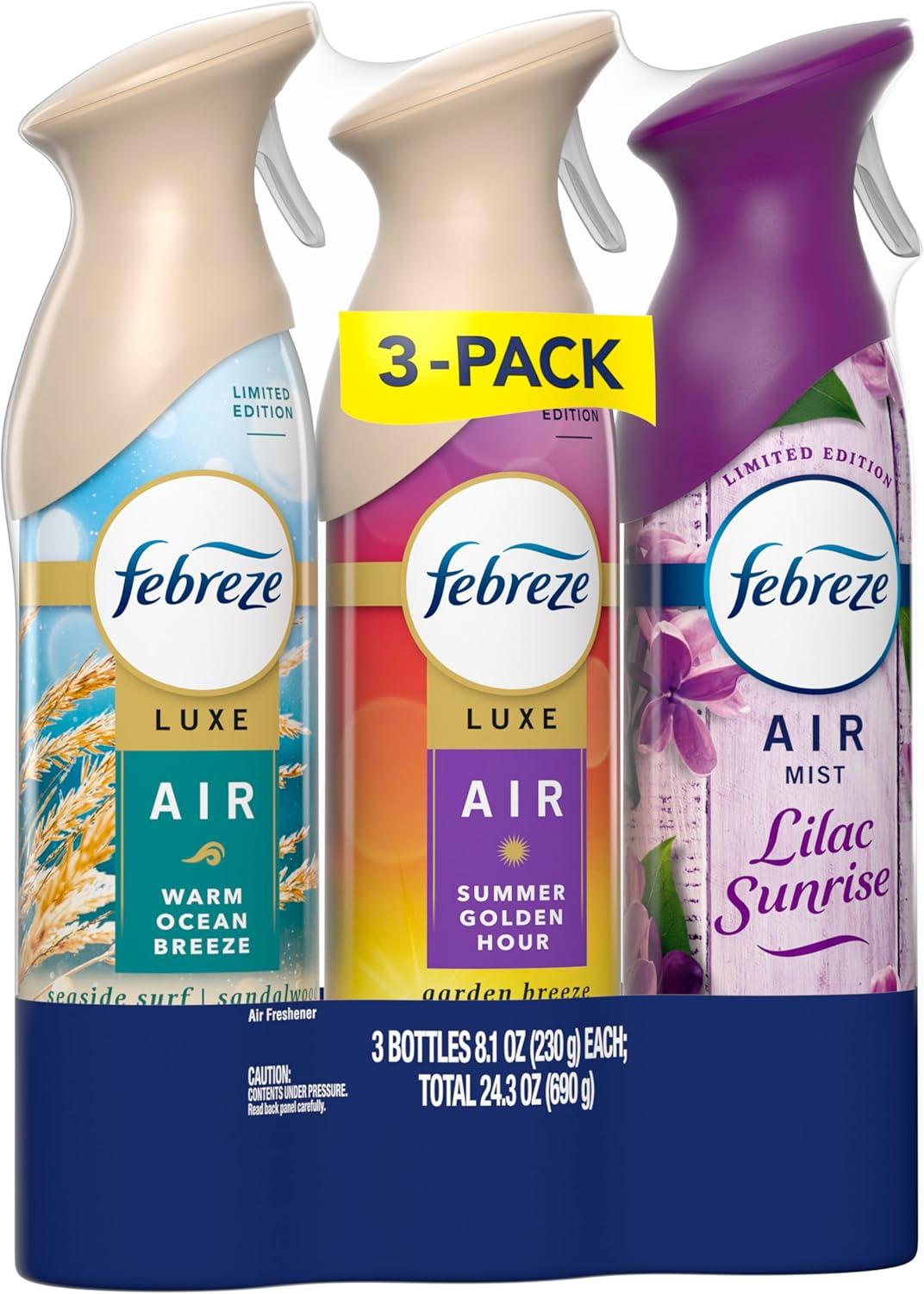 Febreze Air Mist, Air Freshener, Odor Fighting Room Spray, Deodorizer for Home Bathroom Kitchen Office Apartment, Lilac Sunrise, Warm Ocean Breeze, Summer Golden Hour Variety Pack, 8.1oz (Pack of 3)(Spring Mix Pack)