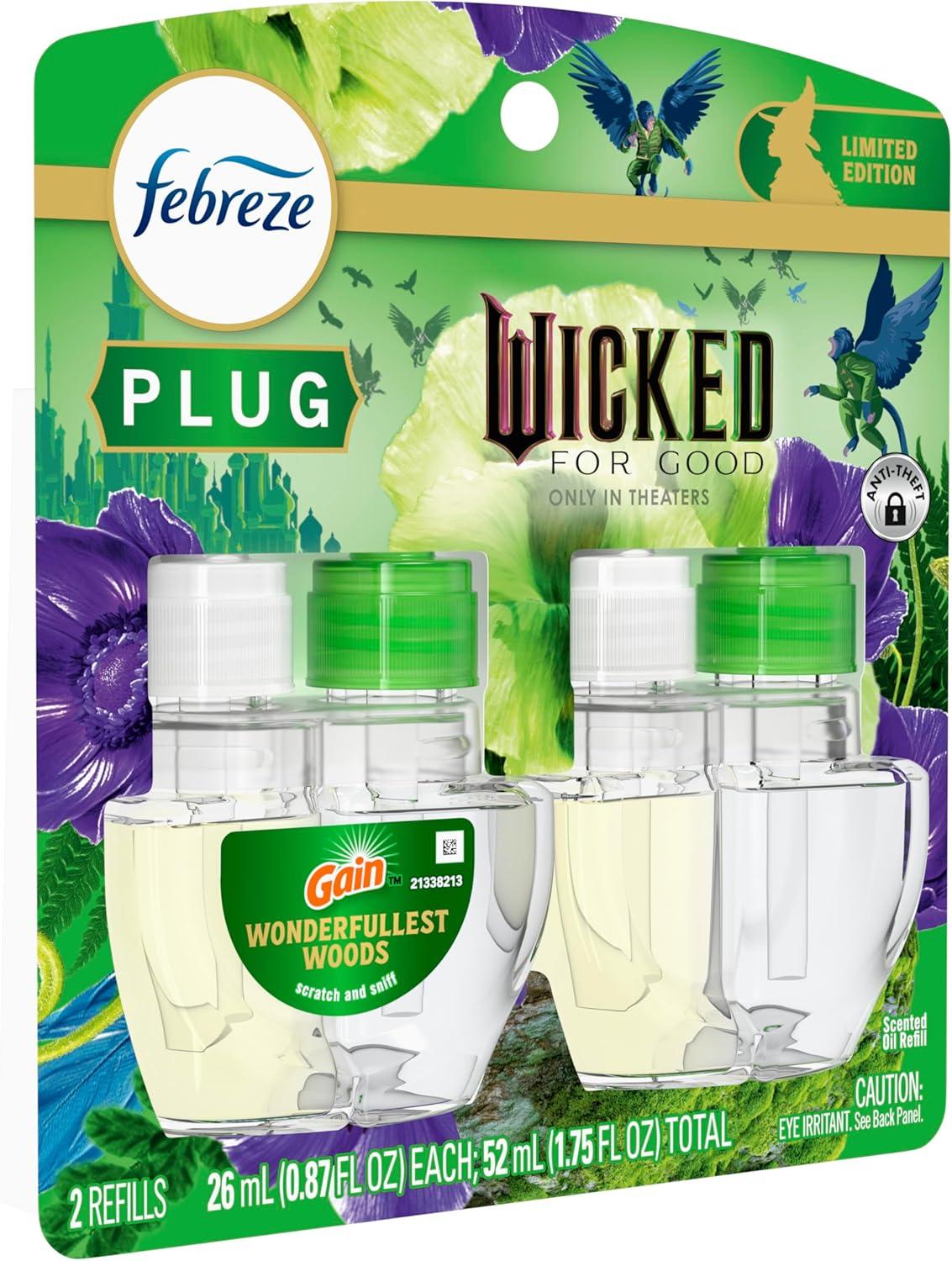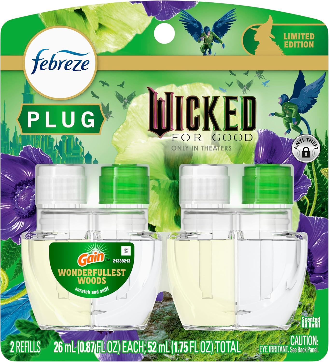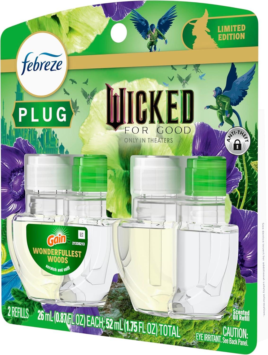 Febreze Plug In Air Freshener, "Wicked: For Good" Limited Edition Odor-Fighting Scented Oil Refill, Air Fresheners for Home and Bathroom and Kitchen, Long Lasting, Wonderfullest Woods, 2 Count(Wonderfullest Woods)