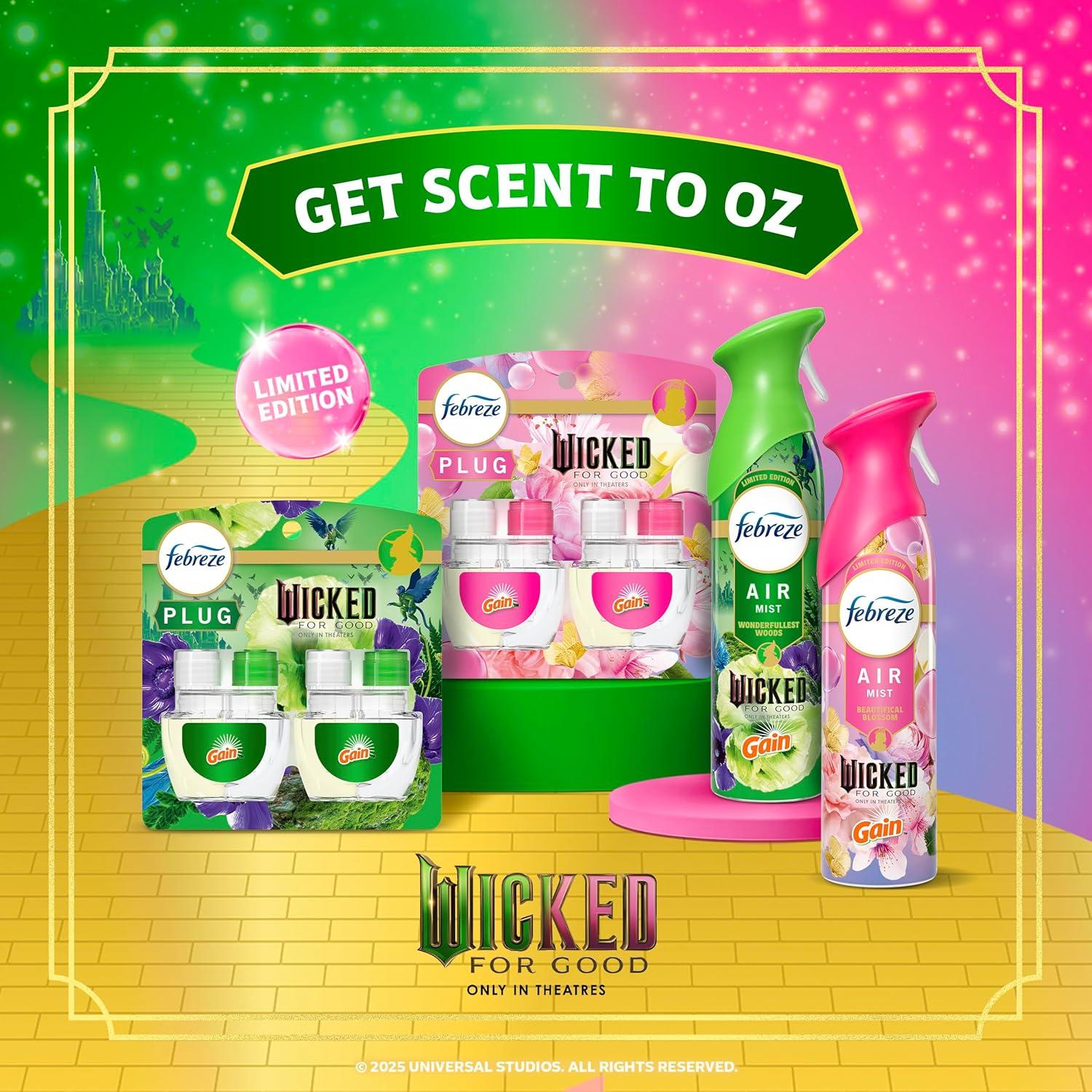 Febreze Plug In Air Freshener, “Wicked: For Good” Limited Edition Odor-Fighting Scented Oil Refill, Air Fresheners for Home and Bathroom and Kitchen, Long Lasting, Wonderfullest Woods, 2 Count(Beautifical Blossom)